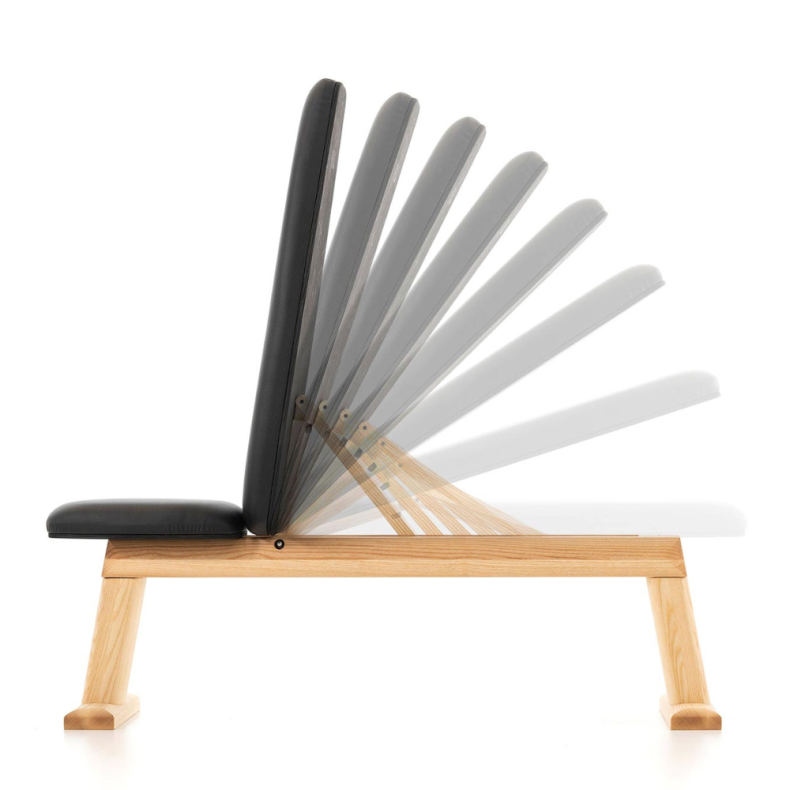 NOHRD WeightBench er en solid, funktionel og moderne træningsbænk til bænkpres og en bred vifte af styrkeøvelser med eller uden håndvægte. Ryglænet kan nemt justeres i otte forskellige positioner fra en helt flad til en helt oprejst bænk. Samtidig har ryglænet en god længde, hvilket giver en stabil rygstøtte. Sædet kan indstilles i to højder og har en bredde på 35 cm, der ligeledes giver masser af støtte. Det polstrede læderbetræk giver samtidig optimal komfort under hele træningen. Træningsbænken er fremstillet i massivt, bæredygtigt hårdttræ og kan bære op til 400 kg.